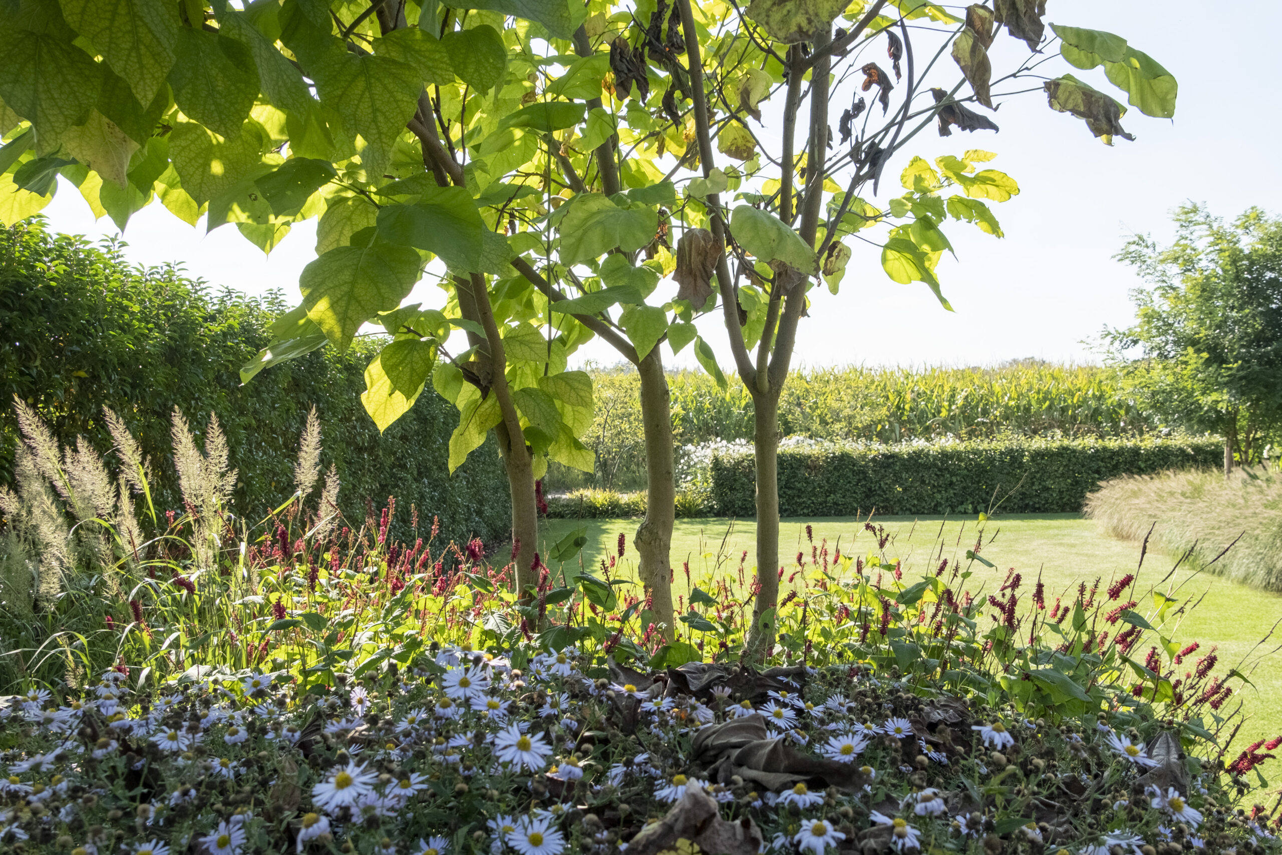 We gebruiken volwassen bomen, siergrassen en bloeiende vaste planten die structuur, kleur en beweging brengen.