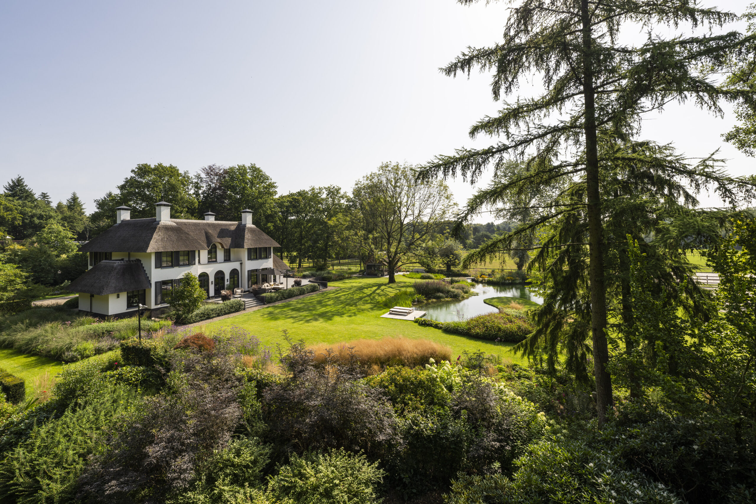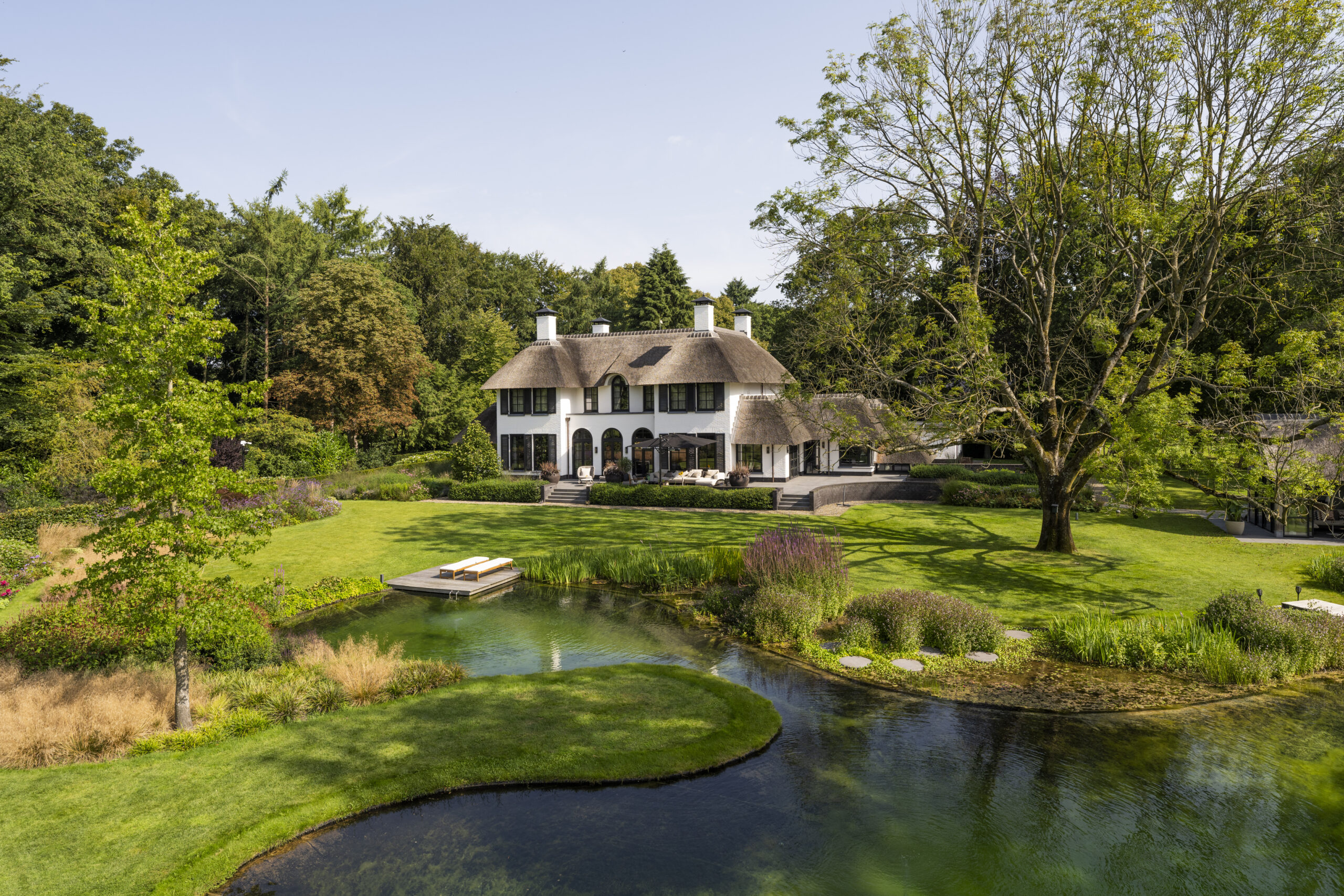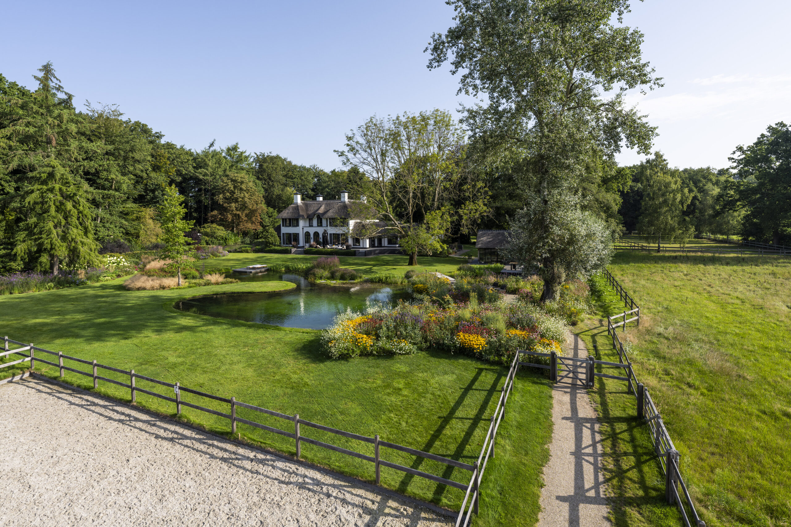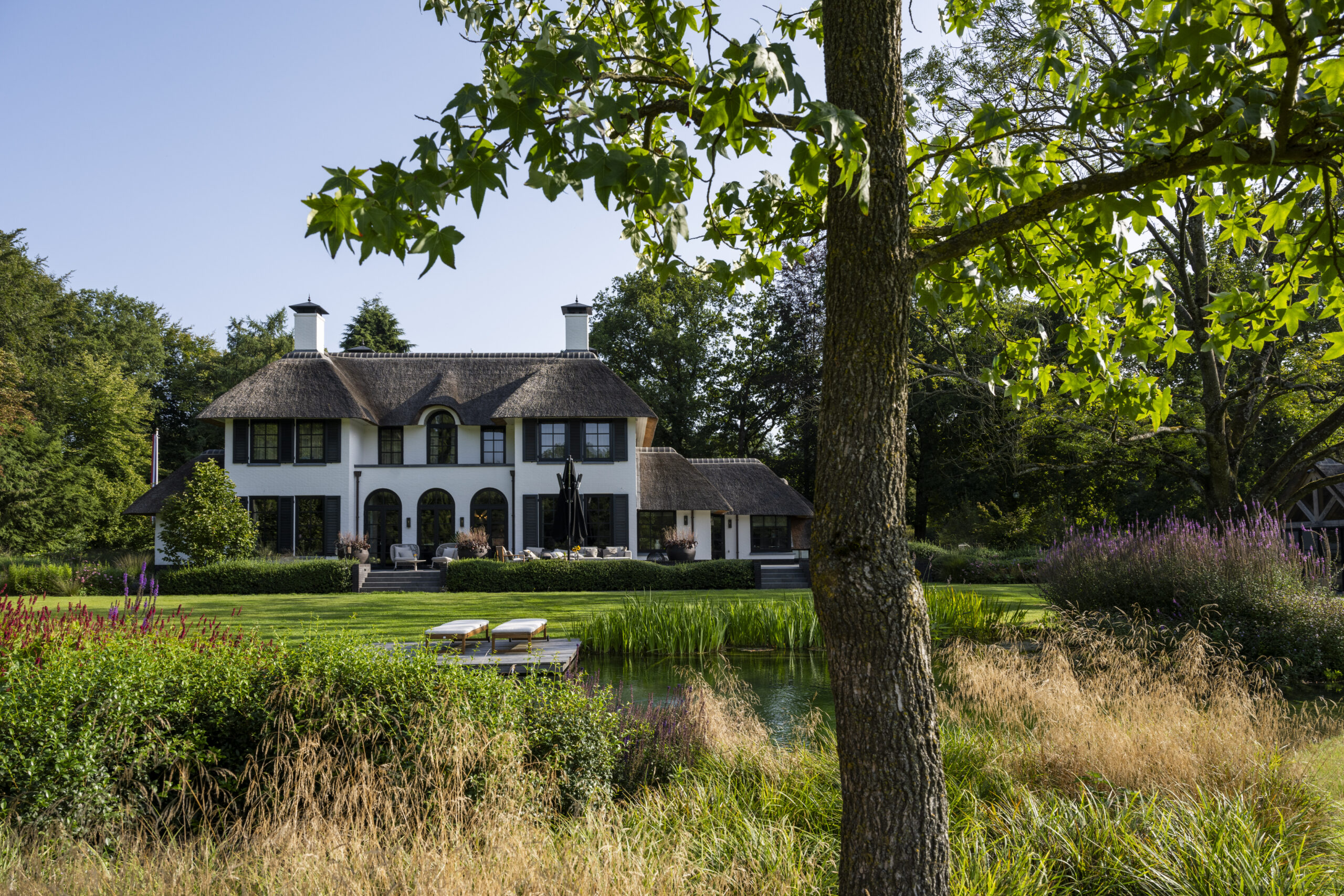 Te midden van een groen landschap ontwierpen en realiseerden wij een exclusieve landgoedtuin die luxe en natuur harmonieus samenbrengt. Het statige witte landhuis met rieten kap vormt het middelpunt van de tuin, die is opgebouwd uit verschillende groene kamers, kleurrijke borders en een unieke zwemvijver.