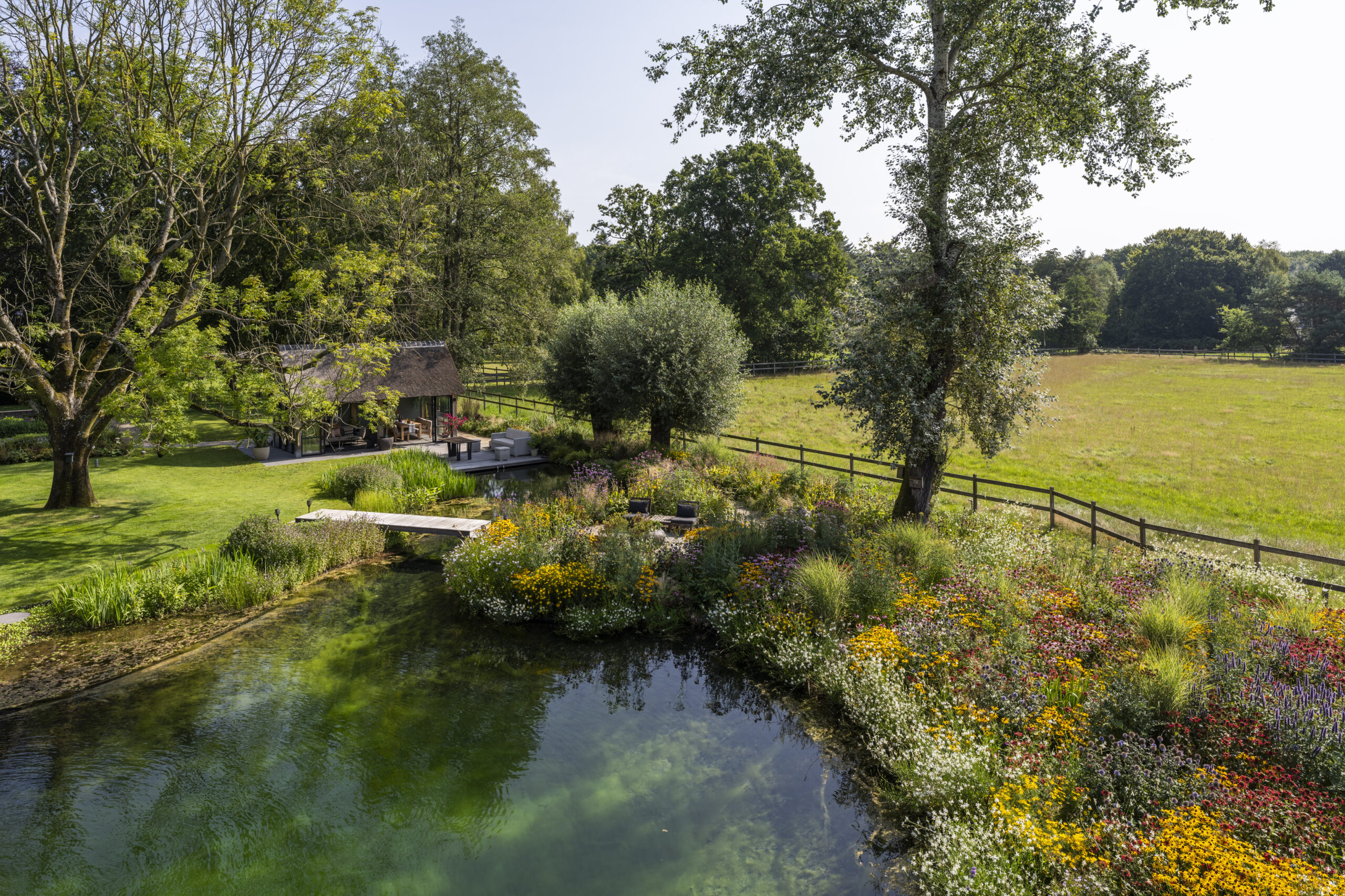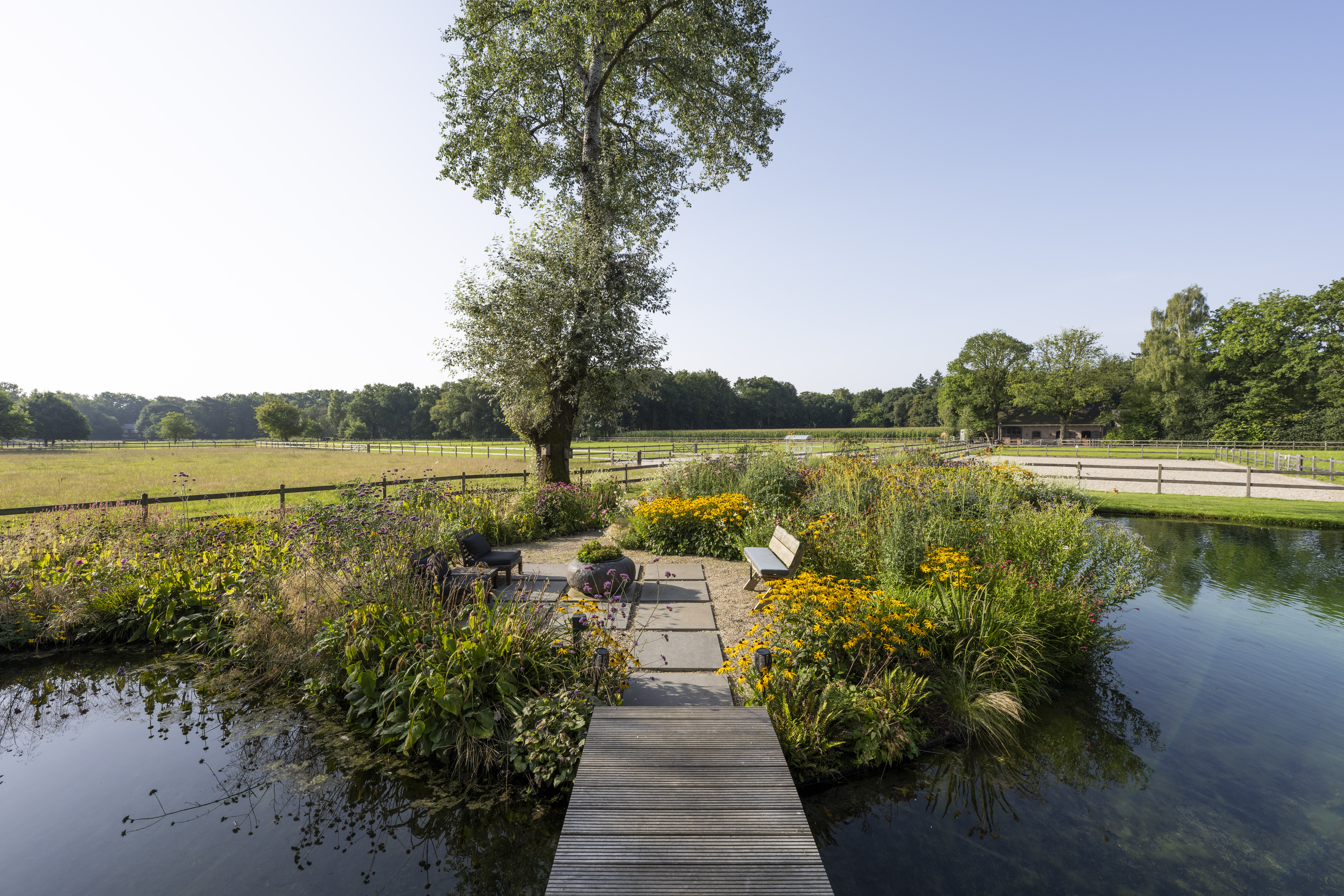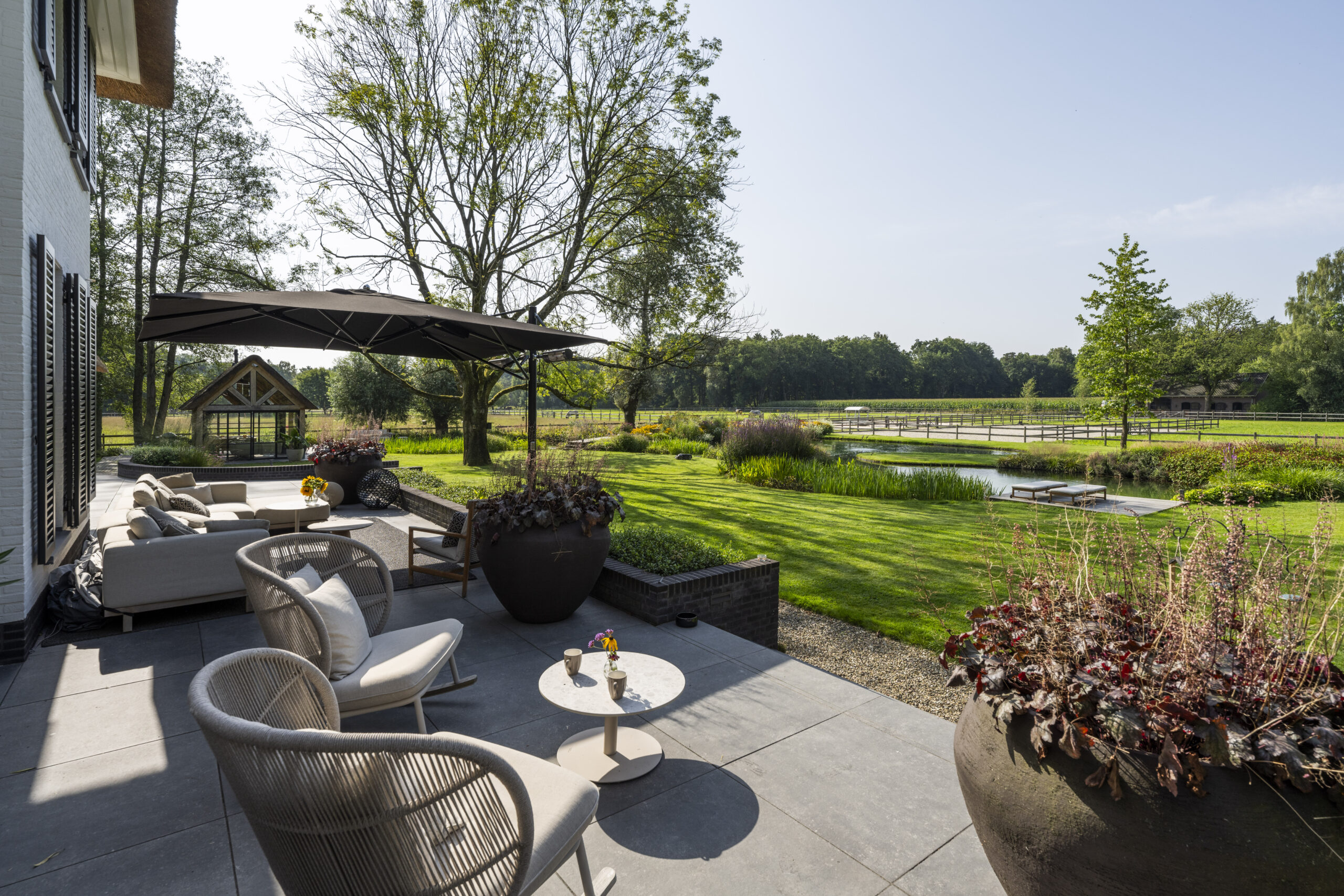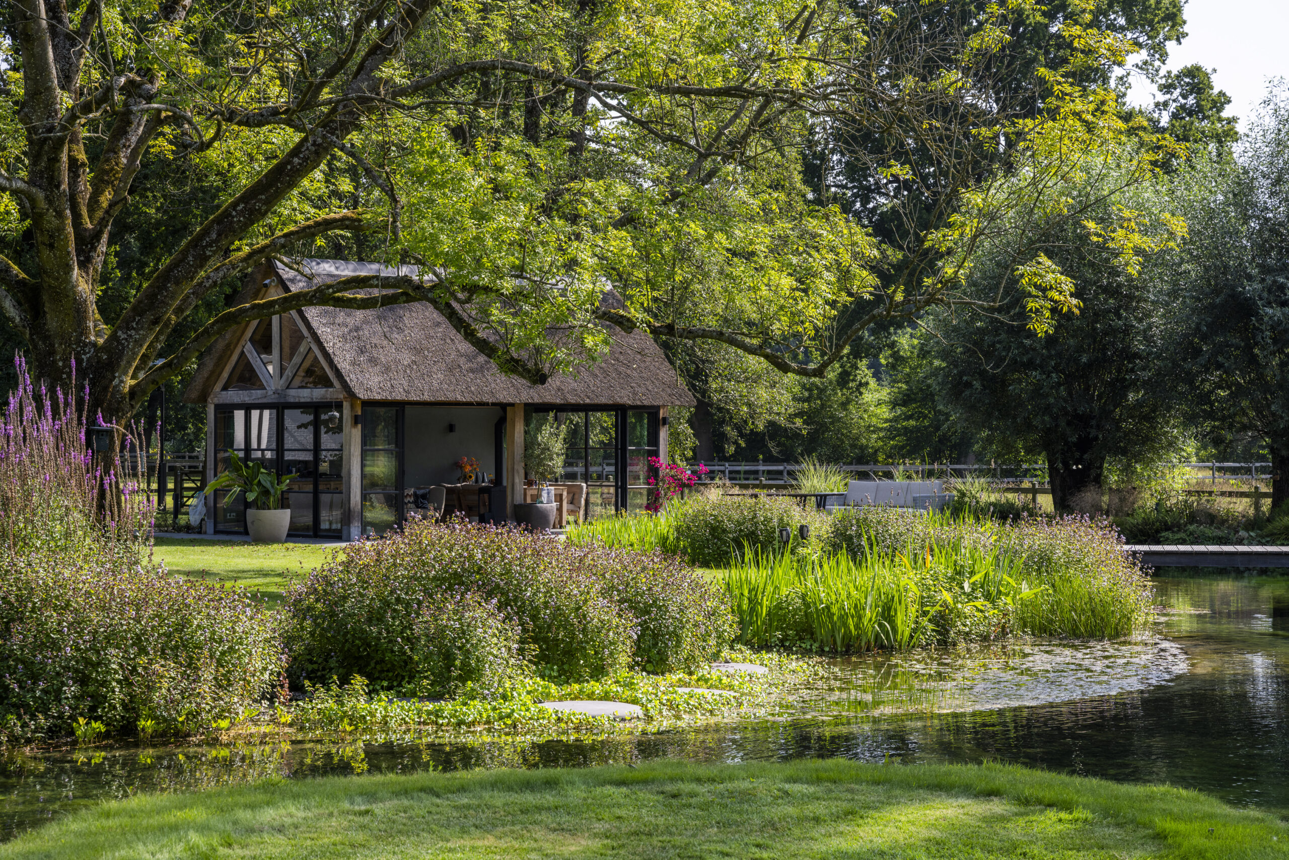 Naast de zwemvijver zijn er diverse plekken gecreëerd om te ontspannen: een sfeervol prieel met rieten dak, een intiem zitgedeelte aan het water en royale terrassen bij het huis. De tuin is ontworpen met oog voor beleving door de seizoenen heen. Van kleurrijke vaste planten en uitbundige bloeiers in de zomer, tot siergrassen en structuurrijke beplanting die ook in de winter hun schoonheid behouden