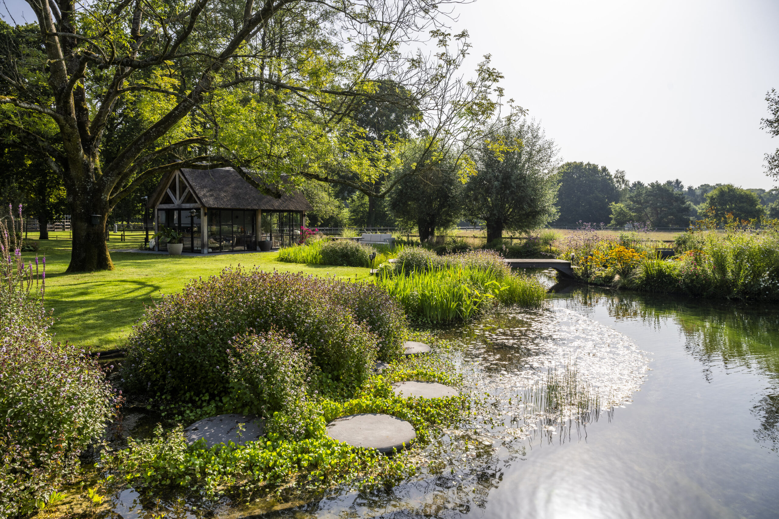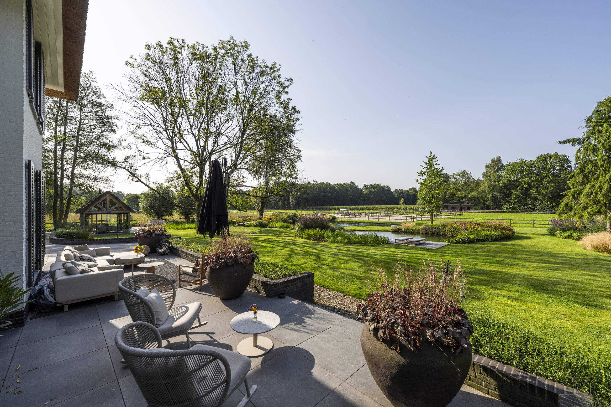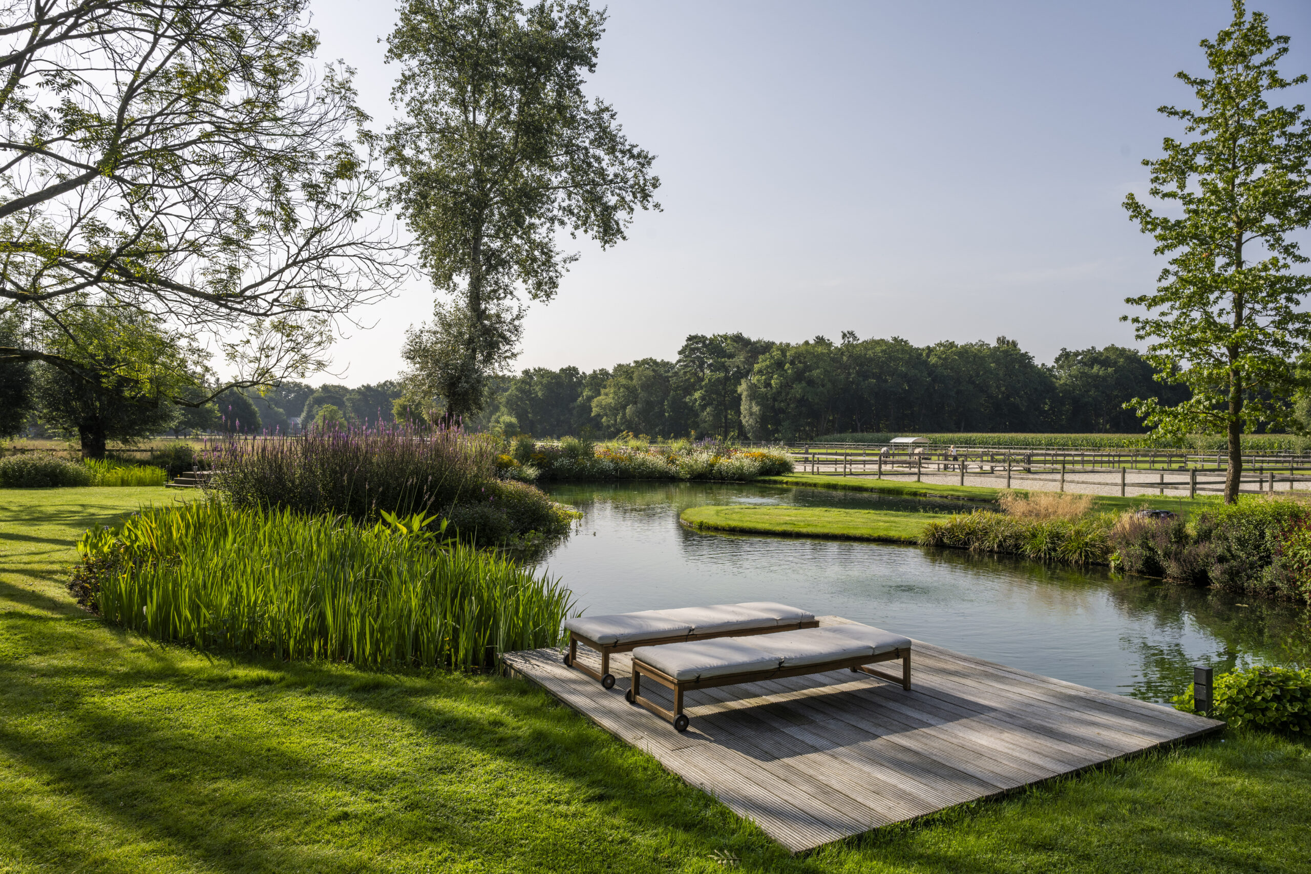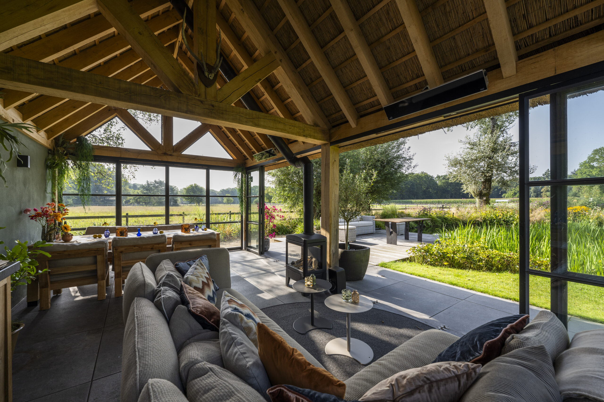 Naast de zwemvijver zijn er diverse plekken gecreëerd om te ontspannen: een sfeervol prieel met rieten dak, een intiem zitgedeelte aan het water en royale terrassen bij het huis. De tuin is ontworpen met oog voor beleving door de seizoenen heen. Van kleurrijke vaste planten en uitbundige bloeiers in de zomer, tot siergrassen en structuurrijke beplanting die ook in de winter hun schoonheid behouden