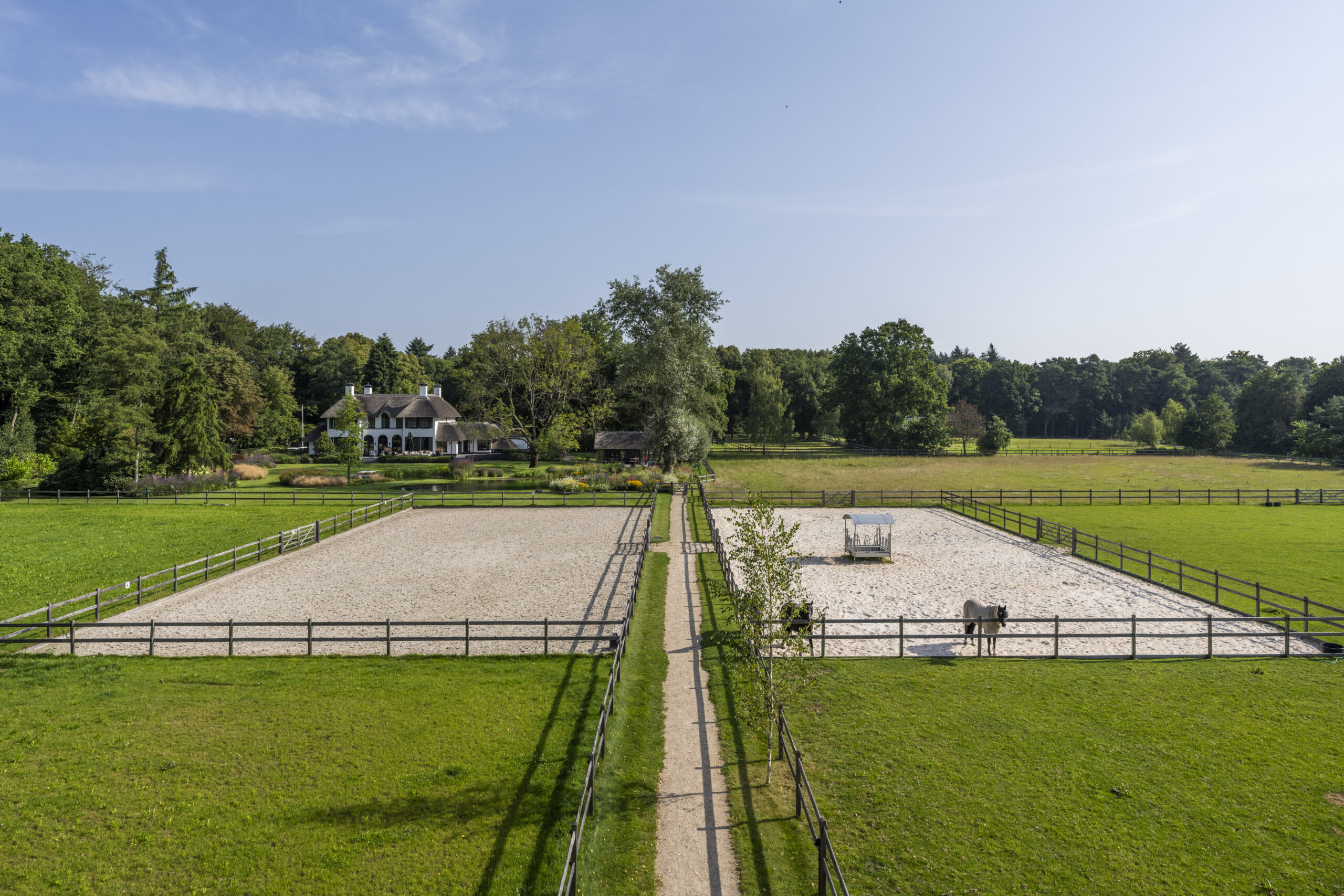 Bij aankomst leidt een elegante oprijlaan naar het huis, omringd door strak gesnoeide hagen en zorgvuldig gekozen beplanting. Dit geeft het geheel een klassieke, statige uitstraling, passend bij de architectuur van de villa.