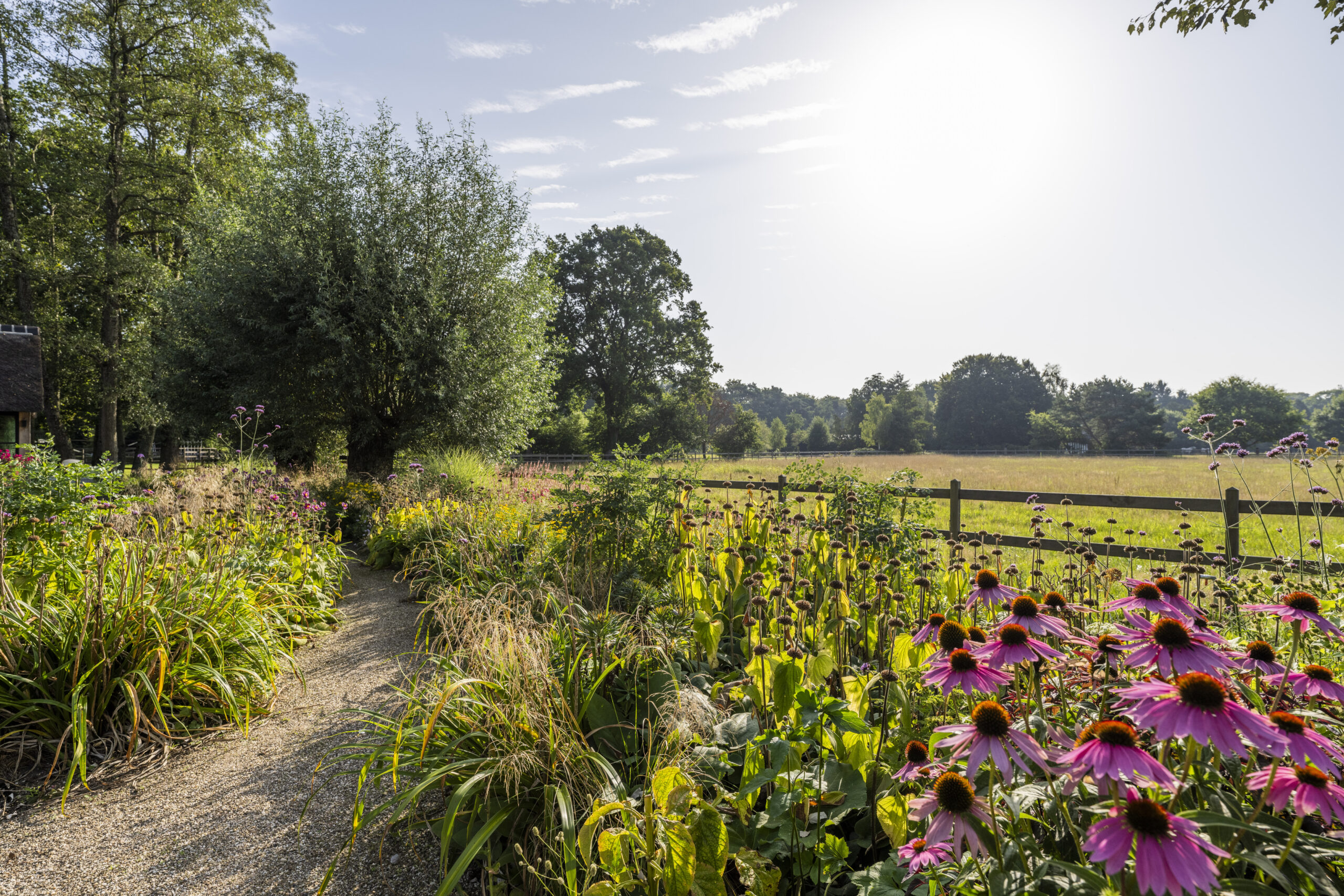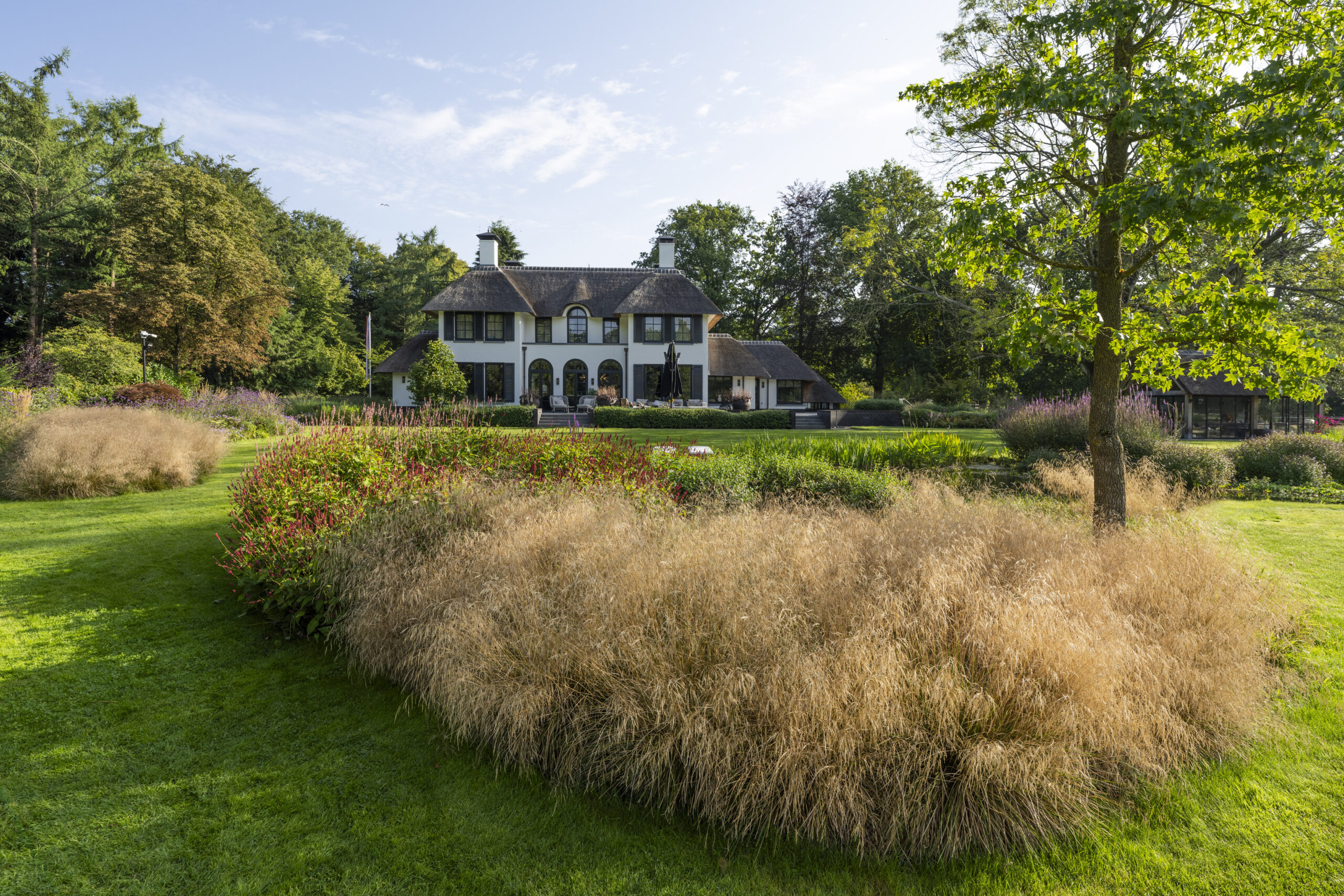 Deze landgoedtuin ademt rust en ruimte. De lange zichtlijnen, grote gazons en volwassen bomen versterken het gevoel van openheid, terwijl bloeiende borders en siergrassen voor kleur en seizoensbeleving zorgen.