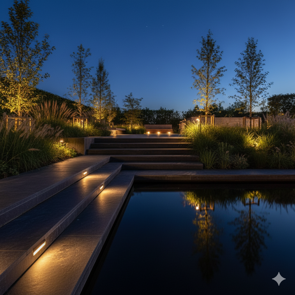 Meeuwis de Vries Tuinen ontwerpt verlichting die de tuin niet verlicht, maar laat ademen subtiel, functioneel en in balans met het ontwerp.