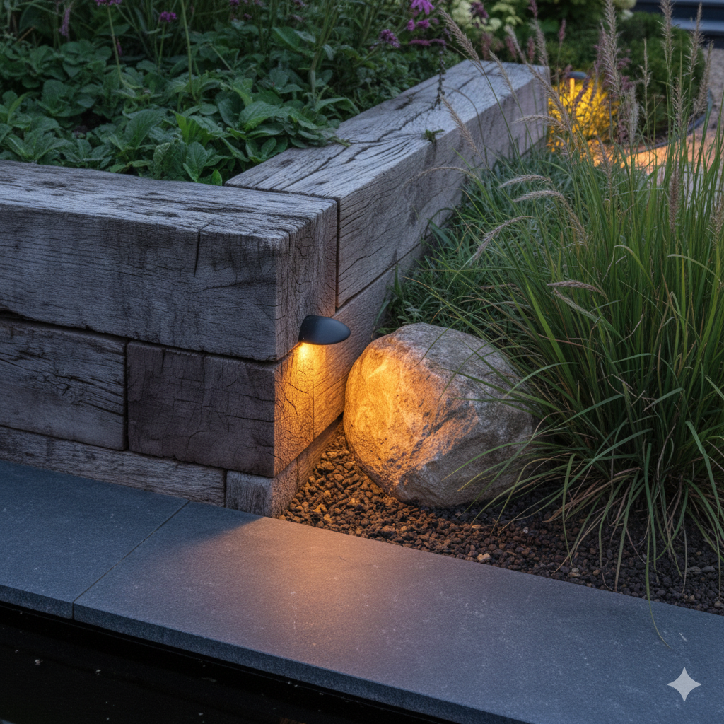 Door verlichting te integreren in muren, trappen, terrassen of borders blijft de tuin zijn natuurlijke uitstraling behouden.